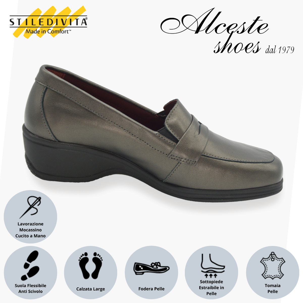 Mocassino donna in pelle perlato canna di fucile, con suola flessibile anti scivolo, calzata larga, fodera in pelle, sottopiede in pelle imbottito estraibile e lavorazione mocassino cucito a mano.