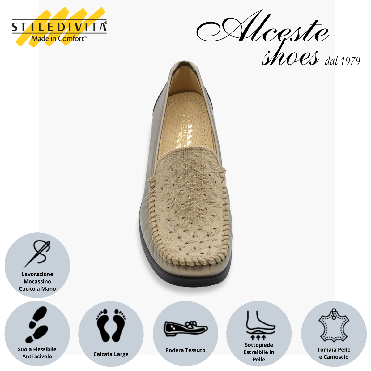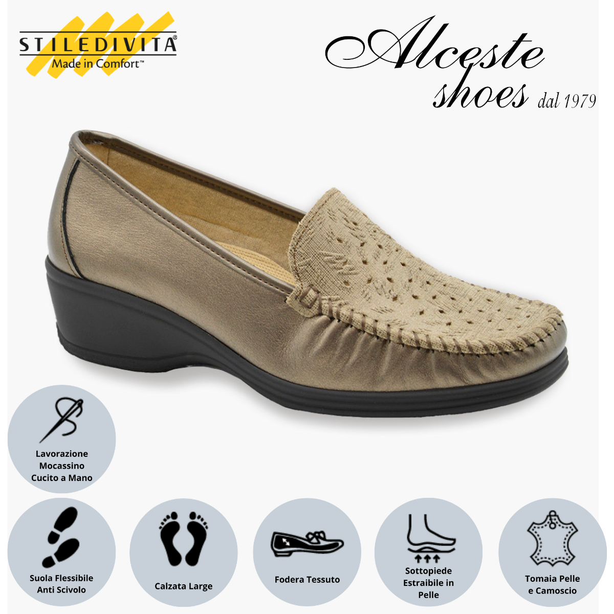 Mocassino traforato da donna in pelle e camoscio stampato bronzo, con suola flessibile anti scivolo, calzata larga, fodera in tessuto, SOTTOPIEDE ESTRAIBILE in pelle imbottito e lavorazione mocassino cucito a mano.