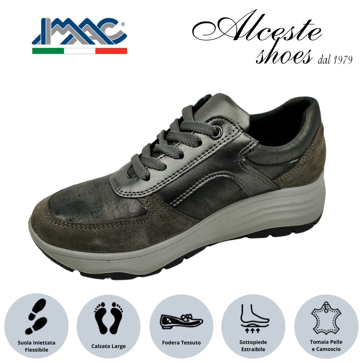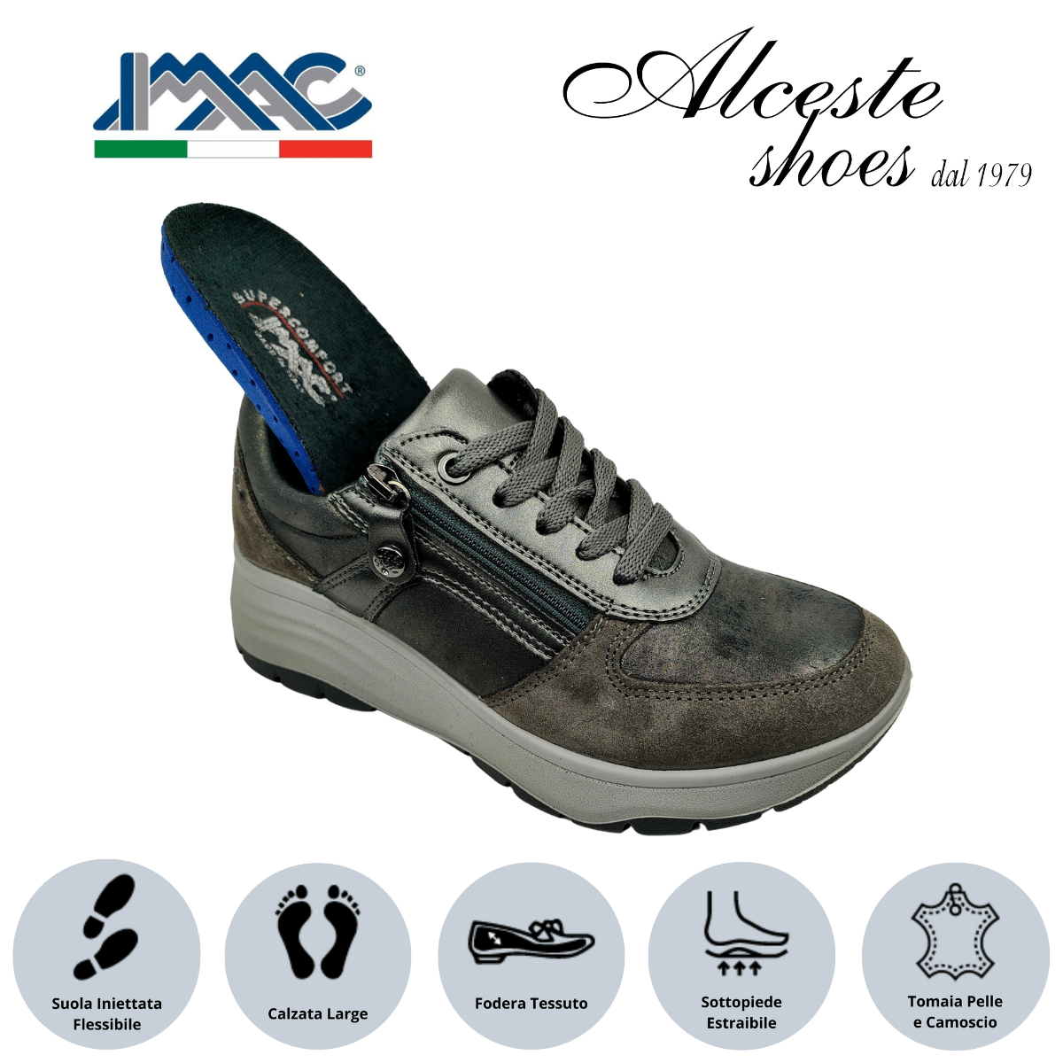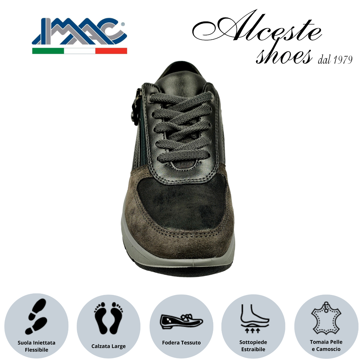 Sneakers Donna con Lacci e Cerniera “Imac” Art. 656300 in Tessuto Elastico, Camoscio e Pelle Grigio